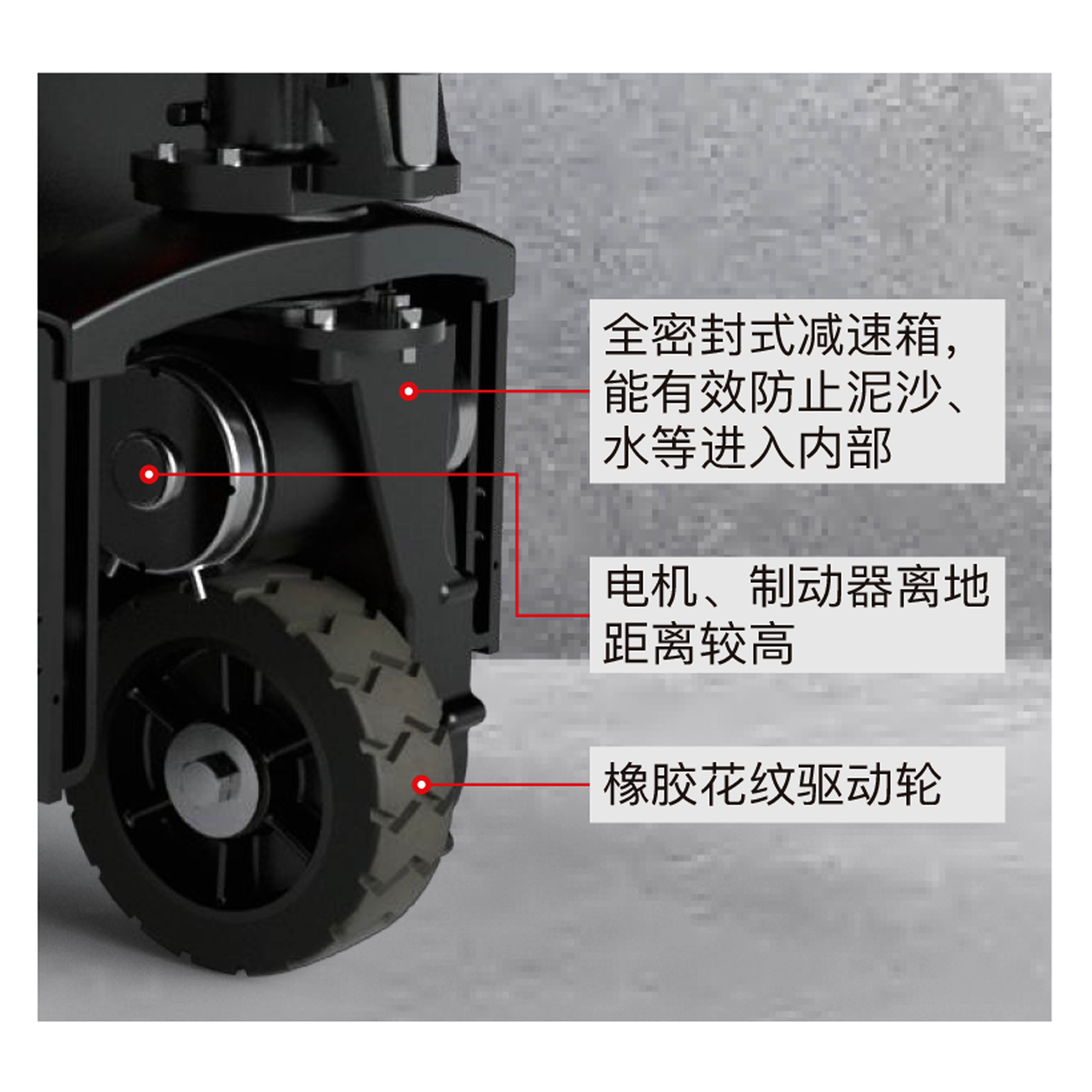 Rugged Terrain: With its optimized wheels and fully covered gearbox, this pallet truck is perfect for navigating muddy roads or wet spaces.